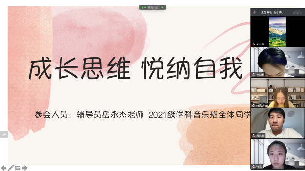 为迎接“5·25心理健康节”、缓解同学们在期末到来之际面临的学业压力等,教育学院21级学科教学(音乐)班于5月24日召开 “成长思维 悦纳自我”线上主题班会。辅导员岳永杰老师莅临指导,班长陈杨主持。学科音乐班共9名同学准时参会,共同度过一段别有意义的时光。