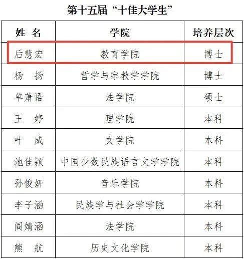 为深入挖掘和宣传表彰大学生先进典型,充分发挥先进典型的示范引领作用,进一步激励广大学生努力成长为担当民族复兴大任的时代新人,党委学生工作部组织开展了主题为“请党放心 强国有我”的第十五届“十佳大学生”评选活动。本届评选活动首次将研究生纳入评选范围,通过学生个人申报,学院初评推荐,党委学生工作部组织相关部门负责人组成评审小组进行审核和评议,从32名推选人选中评选出了20名候选人。然后通过网络大众评审,党委宣传部、党委学生工作部、研究生院、教务处、校团委等相关部门负责人组成专家评审组,以公开评议方式对来自18个学院的20名候选人的线上展示和事迹材料进行复评,党委副书记、副校长李计勇出席复评活动。根据评议总得分高低确定前10名同学获得“十佳大学生”荣誉称号,后10名同学获得“十佳大学生提名奖”。我院2019级博士研究生后慧宏最终荣获第十五届“十佳大学生”荣誉称号。