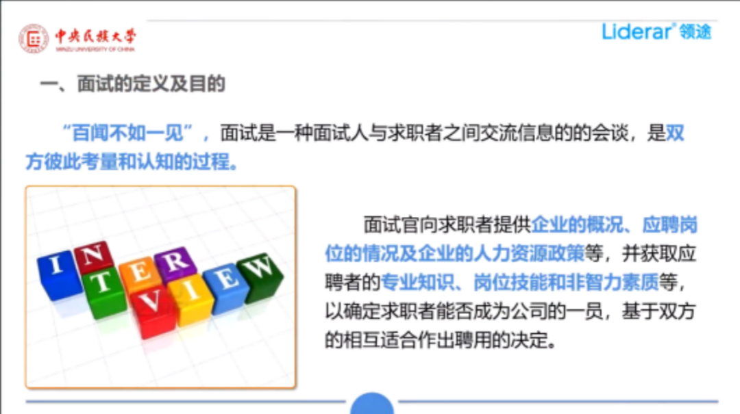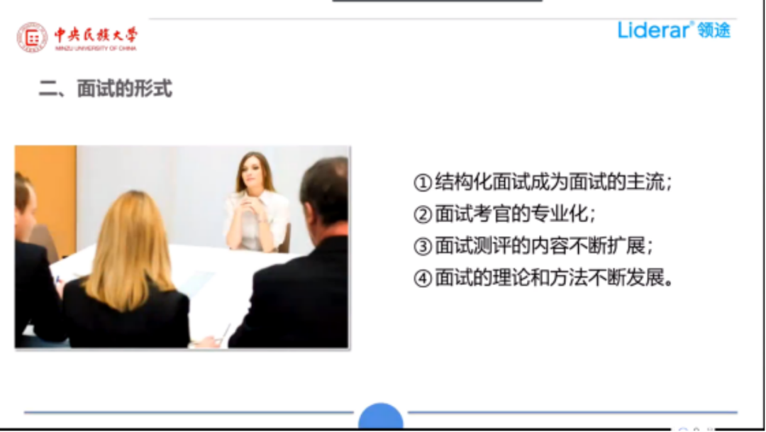 在“面试方式”部分,侯华玲首先介绍了面试的定义和目的。她指出,面试是面试官与求职者之间交流信息的会谈,是双方彼此考量和认知的过程。在这个过程中,面试官要向求职者提供企业的概况、应聘岗位的情况等信息,而作为求职者,要展示自己的专业知识、岗位技能以及非智力素质等,争取成为企业中人岗匹配的一员。随后,她从结构化面试、面试实施的方式、面试的进程三个方面介绍了面试的形式。她强调,在参加面试之前一定要先去了解要进行哪种面试形式,然后有针对性地做准备。