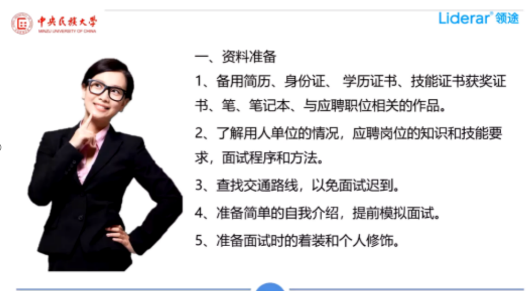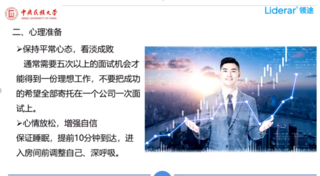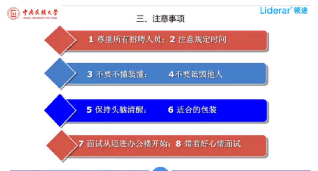 在“面试礼仪”部分,侯华玲从资料准备、心理准备、注意事项和面试礼仪四个方面进行了介绍。在资料准备方面,建议大家在参加面试前务必要检查好自己的相关证件、提前了解用人单位的情况、提前查好交通路线、准备自我介绍并进行模拟面试以及认真准备面试着装。在心理准备方面,提醒大家应保持平常心态,放松心情,增强自信,看淡成败。在注意事项方面,提出了八点注意事项,包括要尊重所有招聘人员、注意规定时间、保持头脑清醒、带着好心情面试等等。在面试礼仪方面,从晕轮效应、职业形象、服饰规范、站坐行姿、敲门礼仪、座谈礼仪、告别礼仪多个角度进行了讲解。