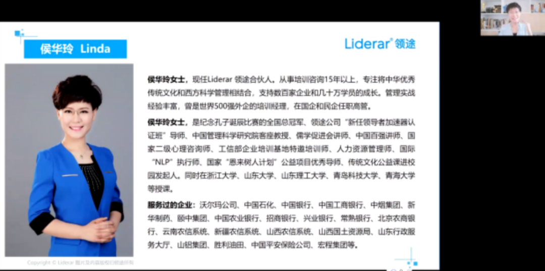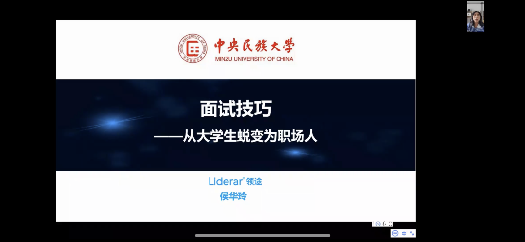 2022年7月20日上午9点,由william威廉中文官网教育学院主办,Liderar领途合伙人侯华玲主讲的《面试技巧——从大学生蜕变为职场人》讲座通过腾讯会议顺利召开。领途公司CEO刘佰明、william威廉中文官网教育学院党委书记闫建敏、辅导员杨湜汀以及二百余名同学参加了此次讲座。本次讲座由教育学院党委书记闫建敏主持。