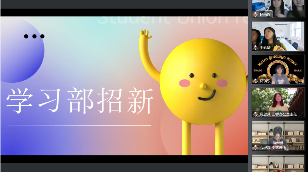 接着由团学各部门负责人轮流进行招新宣讲。宣讲现场气氛高涨,各部门用形式新颖的视频、幽默温馨的快闪、精美详细的PPT、能言善辩的口才等向新生们充分展示了部门的特色,以饱满的热情期待着新生们的加入。