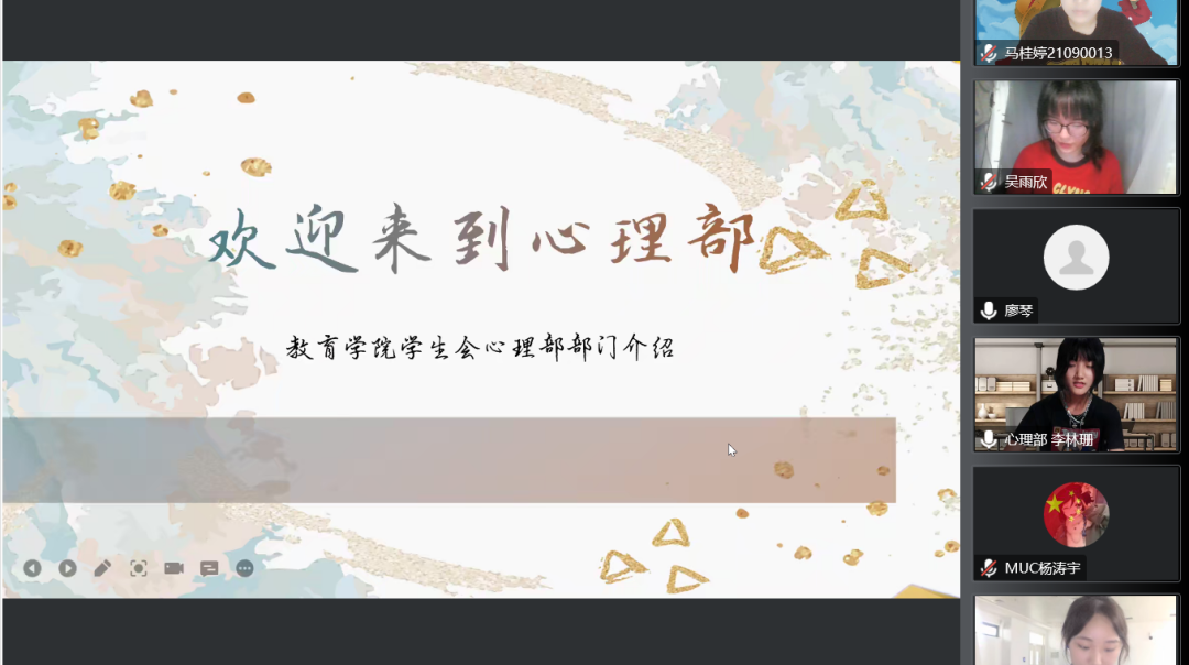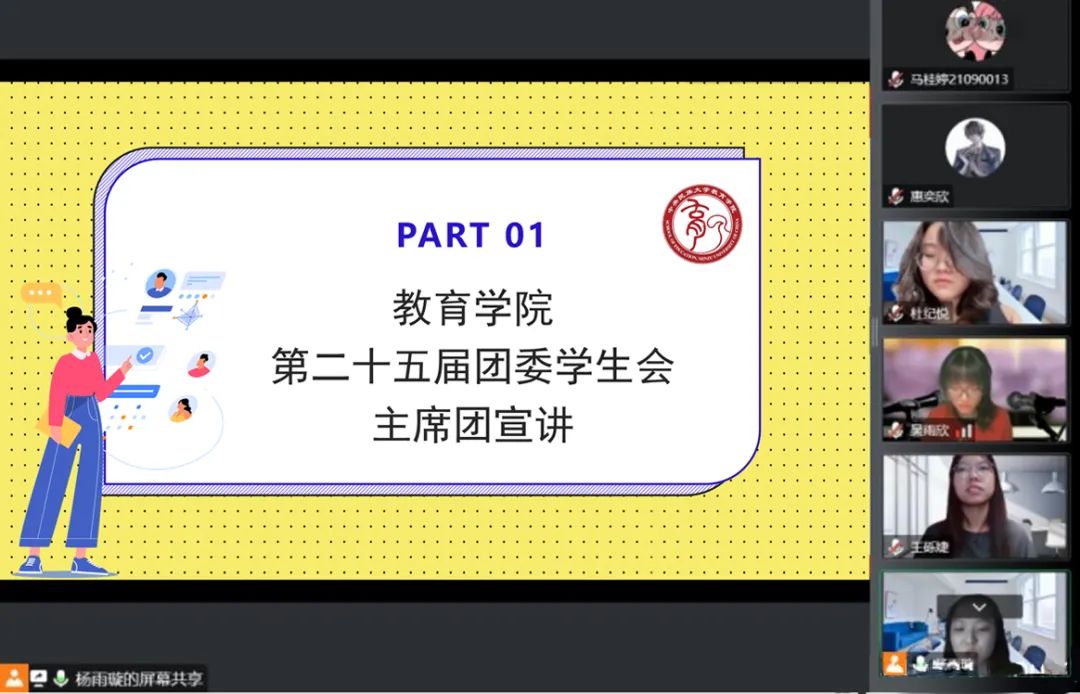 9月17日晚19:30,我院团学组织于线上开展第二十五届团委学生会招新宣讲工作。与会人员有团委副书记杜纪悦、执行主席杨雨璇、吴雨欣、王砾婕,团学各部门负责人以及教育学院2022级本科新生,会议由学生会学习部负责人林进文主持。
