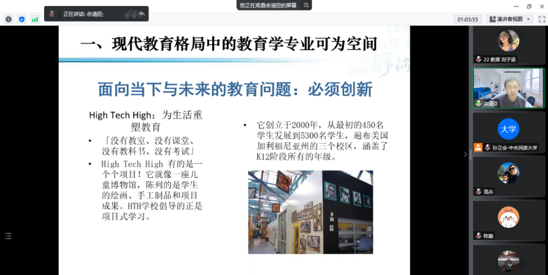 余教授首先结合自己的经历介绍了本次讲座的主题,生动地描述了“教育学”的前世今生,引发同学们思考,教育学究竟何去何从?围绕着“现代教育格局中的教育学专业可为空间”、“当代教育学本科专业价值挑战”、“当代教育学‘本科专业性’的探索与建构”、“当代教育学本科专业发展与学习框架”四个板块,余教授结合实际,系统阐述了当代教育学未来的发展路径,提出面向当下与未来的教育问题,要更多的创造与变革,我们教育学专业的学生更应鼓励自己成为“教育变革的设计师”或“教育变革设计师的专业支持者”,如此教育学的发展才会有更为明朗的开阔地带。