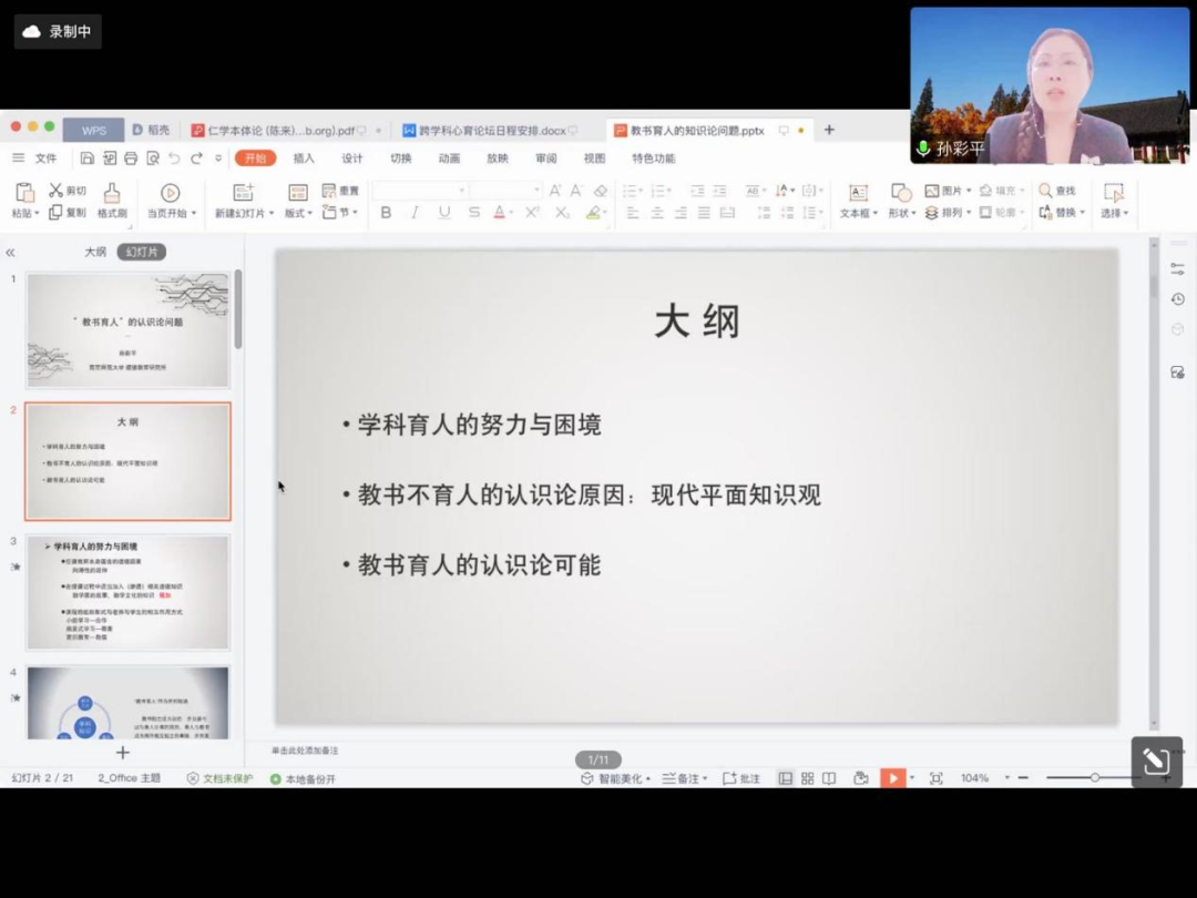 2022年10月21日晚19:00时,教育学院邀请到南京师范大学孙彩平教授作题为 《“教书育人”的认识论问题》的学术讲座。讲座由许丽英教授主持,教育学院师生以及校外教师和学生共计两百余人参与讲座。