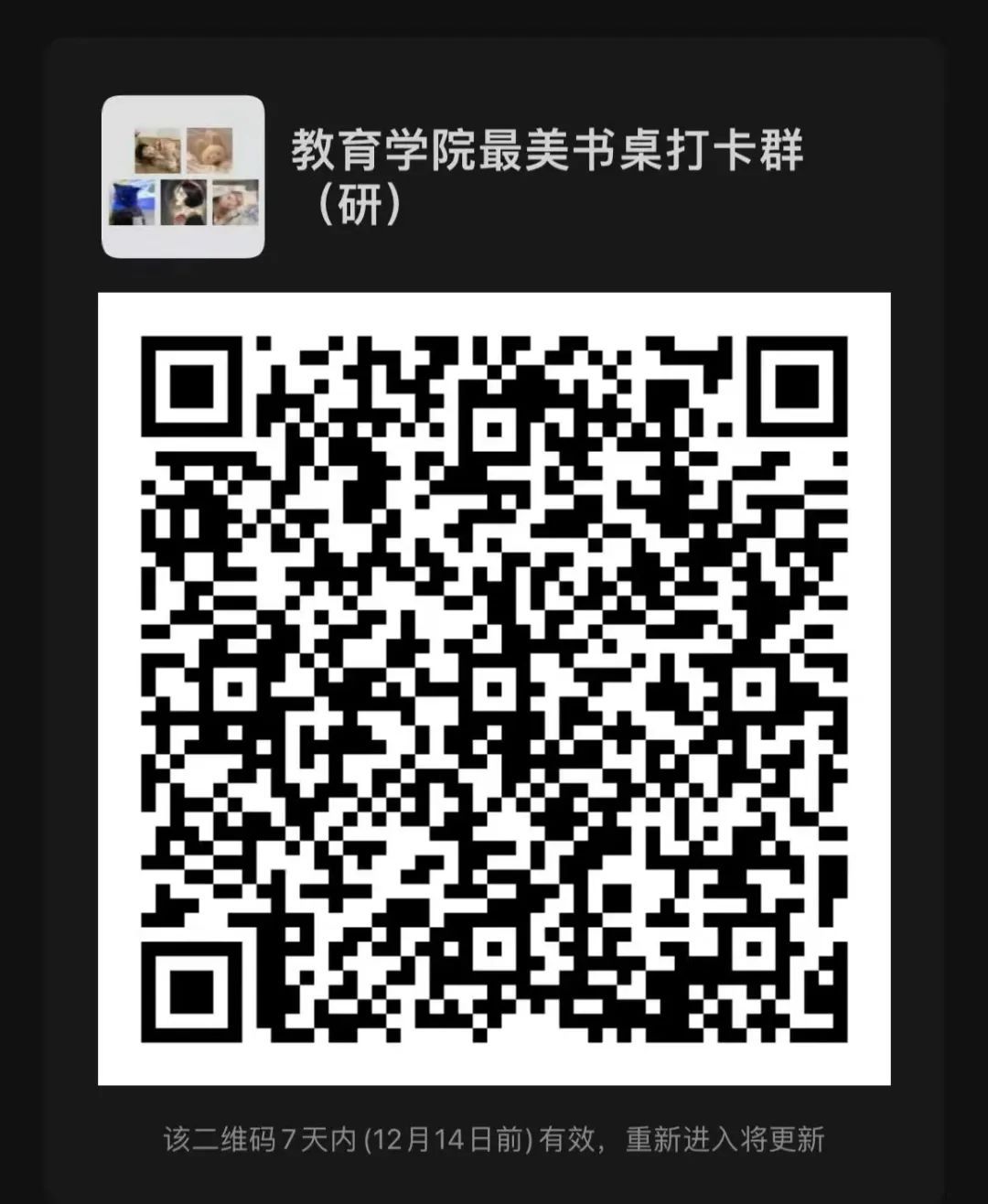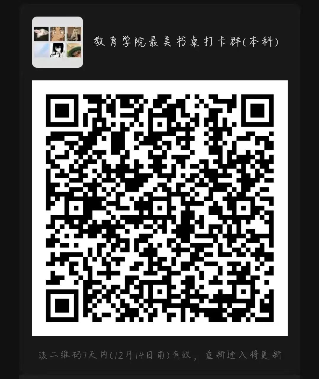 每晚23:00前将书桌打卡照片提交至微信群内小程序“群打卡”进行打卡。工作人员每七日在群内进行一次打卡情况公示。