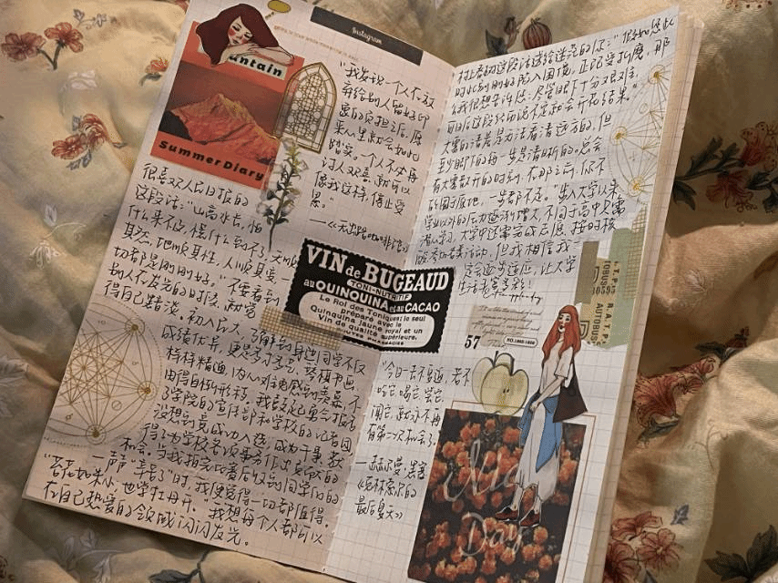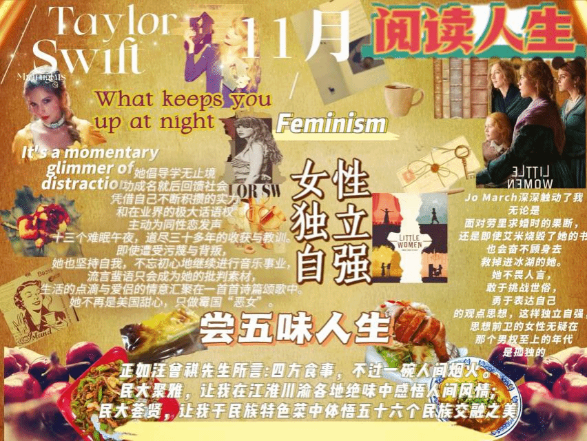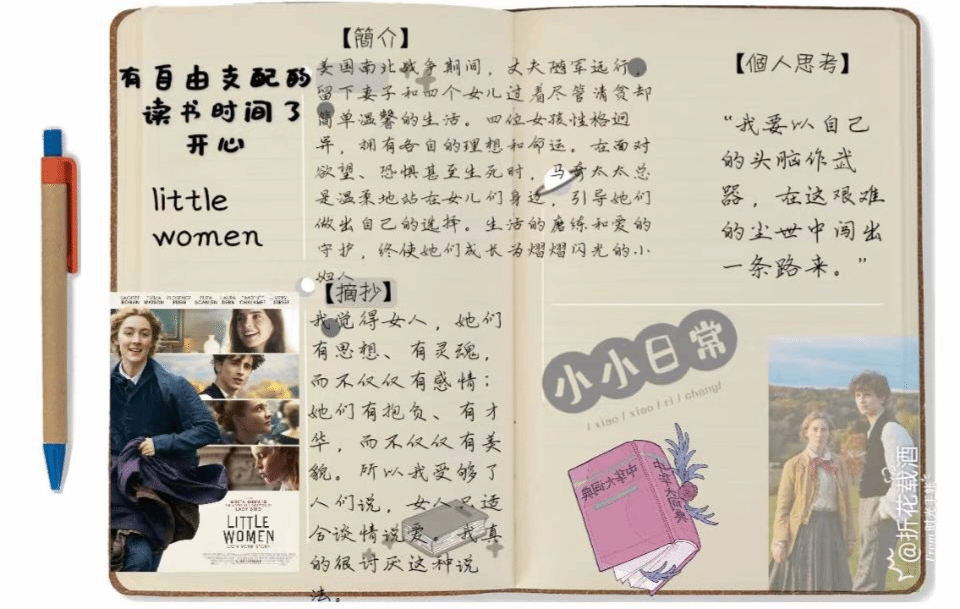 大学是我们青年步入社会的过渡阶段,是决定未来人生的关键时期。于是,我从日常生活片段出发,挖掘由美国女作家路易莎·梅·奥尔科特创作的,强调了个人尊严与自立自律的观念和女权意识的长篇小说《小妇人》,挖掘作品中独立自强的时代精神。同时,在美食与舌尖的碰撞之中感悟人生五味。由此针对阅读人生和美食生活两个板块展开手账制作。