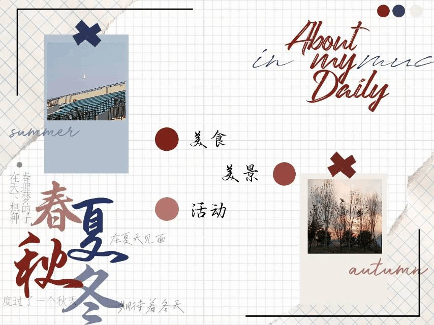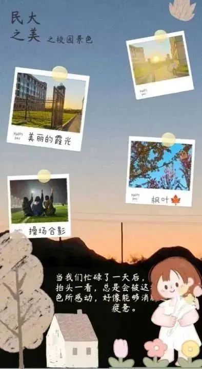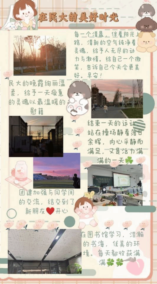 作品以民大之美为主题,分为民大美景、我的生活碎片、生活感受三个篇章,作品主要由丰富的校园摄影图片和文字描述构成,以体现民大的美和学校生活的丰富多彩与充实美满为特色,并且用校园的各角景色作为背景,适当搭配一些可爱精美的卡通贴纸,展现了一个完整的手帐作品。