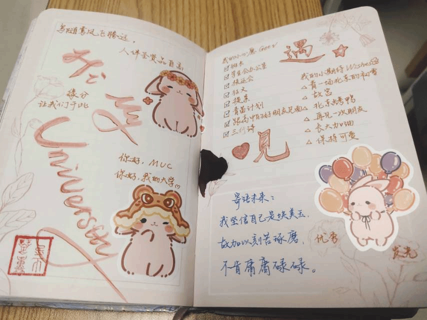 手帐以“我的大学”为主题,分为“遇见”和“未来寄语”两个部分。“遇见”板块包括已经实现的小确幸和未实现的小期待,小确幸有当选班长、加入院学生会办公室、参加校运会、提案拿奖等,小期待有在北京看一场初雪、去故宫参观等;“未来寄语”板块则是对自己的鼓励。