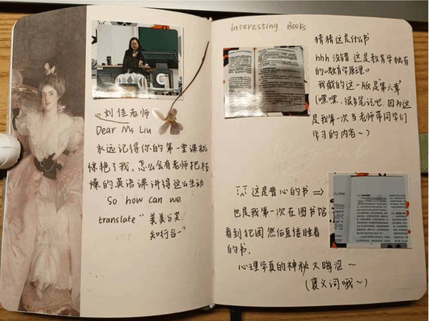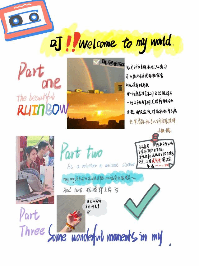 我的手账主要是围绕开学以来学习生活中的一些美好的瞬间展开的。“Even boring hour in my life is unique”,在我从小绘制的蓝图里,大学应该是包容的,开放的,丰富的,多姿多彩的,当我真的来到这里,我发现确实是这样。来自天南海北的我们谈天说地,让友谊的种子生根发芽;快乐之余课业负担虽重却也不如高中时期一般枯燥乏味,所有的所有都是生活。