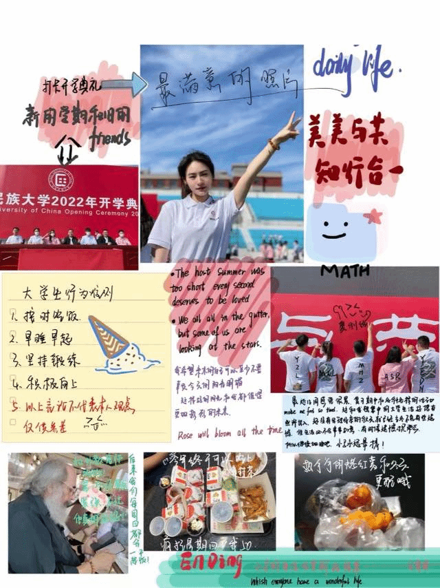 初来民大,观赏着学校晨起日落的美丽景色,感受着学校韵味悠长的文化气息。在这里我结识了许多新朋友,提升了自己的社交实践与能力,学习了广博而丰富的知识,感受到了人间的温情与互帮互助的良好品质。在民大这个美美与共、兼容并蓄的大家庭,我每天都有新的体验与感悟,在此我用手帐记录我在民大的美好时光。