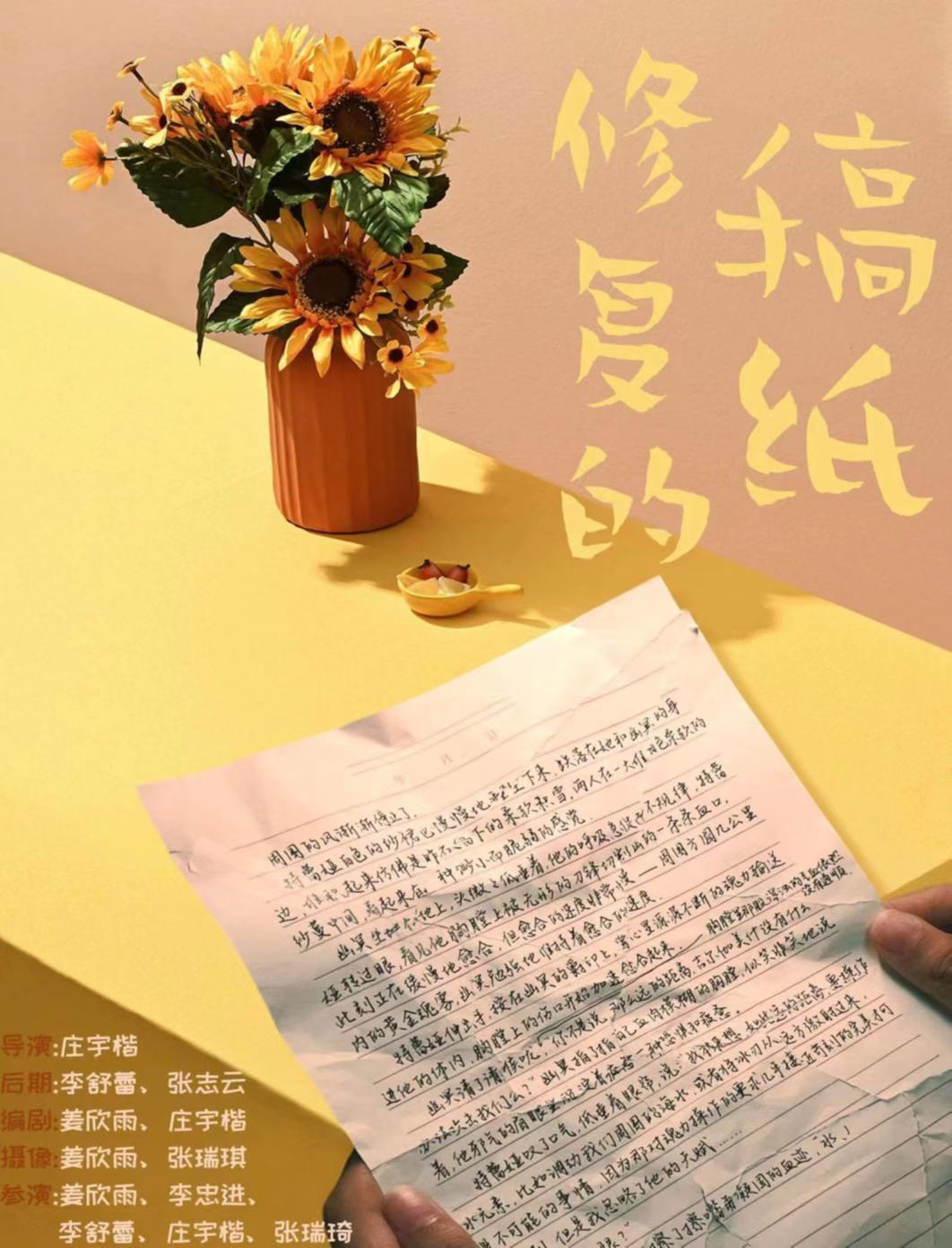 第四部展播的微电影是《修复的稿纸》,本片讲述了因为中学时期同学的欺凌,个性懦弱的小李将自己从小坚持的玄幻小说写作的爱好掩藏起来,直到大学她才遇到了重拾写作的契机。在大学里,她不仅拥有了一个可以自由写作的环境,更是在学长的启发下收获了一颗自由创作的心和一份袒露灵魂的勇气——她终于有勇气面对从前被撕碎的稿纸。她承认,直到这时,这张稿纸才真正被修复,她才能鼓起勇气、大胆写作。本片通过一个简单的故事,鼓励同学们直面生活中他人的目光,敢于坚持自己的理想,更要勇敢地去做自己想做的事,更理性地思考面临的困境。