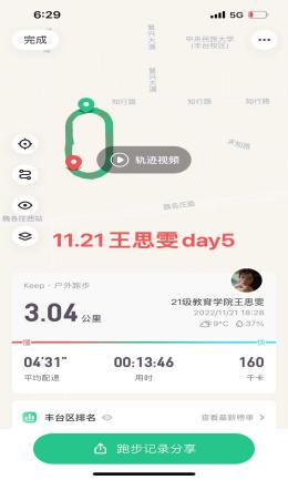 疫情当前,选择参加这个活动是想督促自己养成一个锻炼身体的好习惯,都说“万事开头难”,活动结束,我更想说“成功的路上并不拥挤,只是坚持的不多”,为期20多天的跑步打卡活动,让我经历了寒冷,磨砺了心性,收获了健康。当然这一过程中和朋友们相互鼓励,共同运动,让我这学期的学习生活更添一丝活力与激情!感谢教育学院组织这么有意义的锻炼活动,受益颇多!
