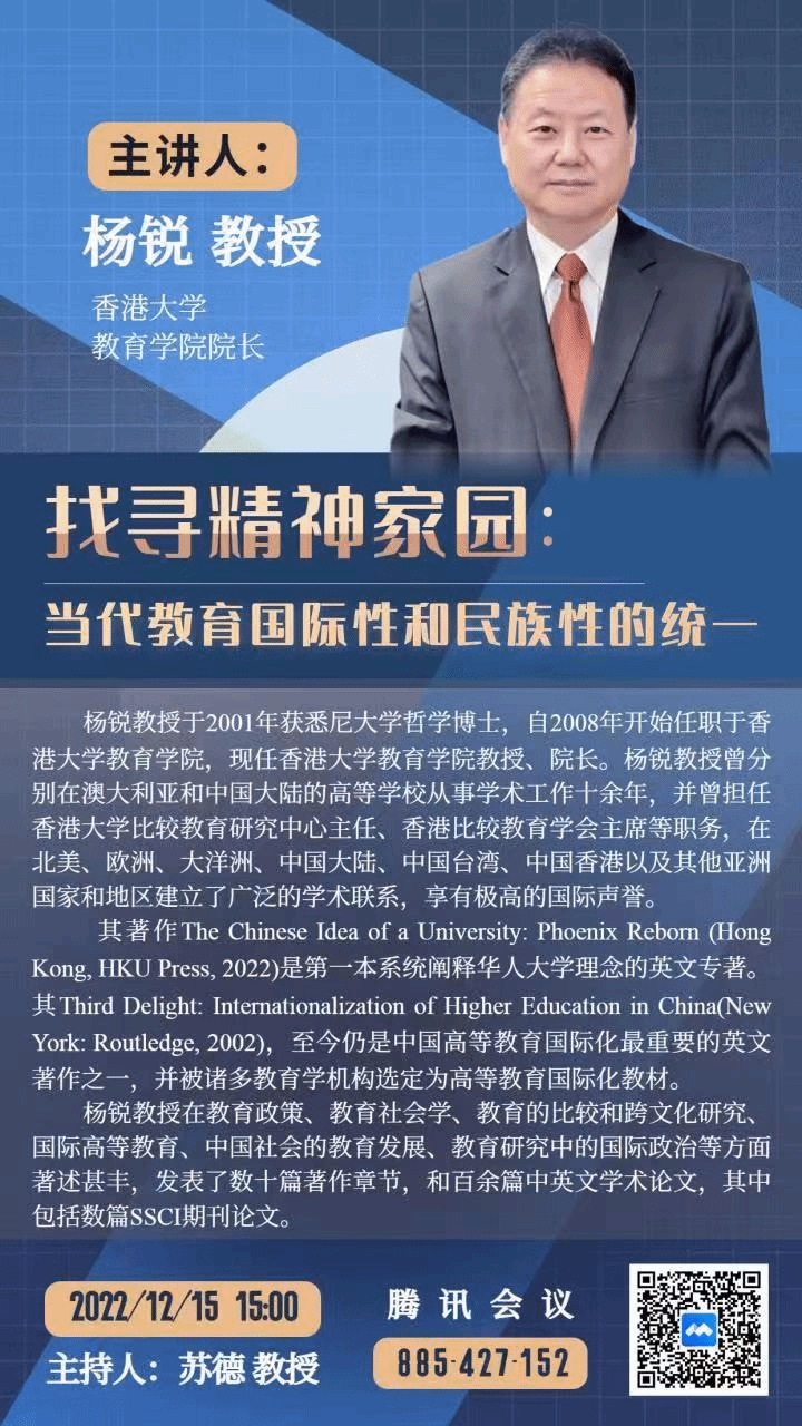 2022年12月15日15:00,教育学院邀请到香港大学教育学院院长杨锐教授,为学院全体师生作题为《找寻精神家园:当代教育国际性和民族性的统一》的讲座。本次讲座由苏德教授主持。