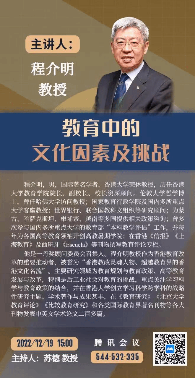 2022年12月19日15:00,教育学院邀请到香港大学程介明教授为学院全体师生作题为《教育中的文化因素及挑战》的学术讲座。本次讲座由苏德教授主持。