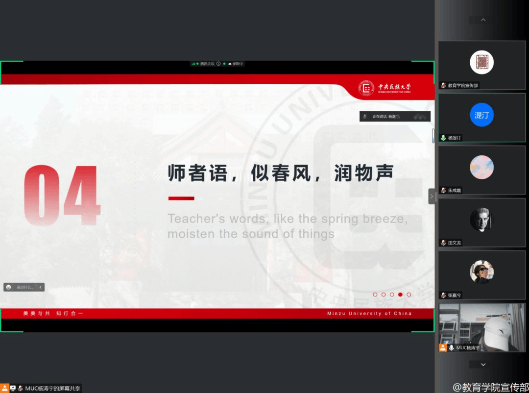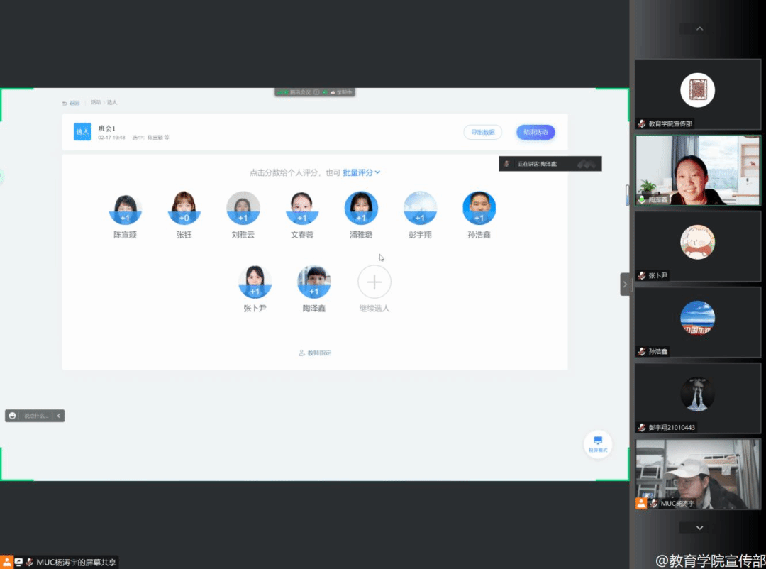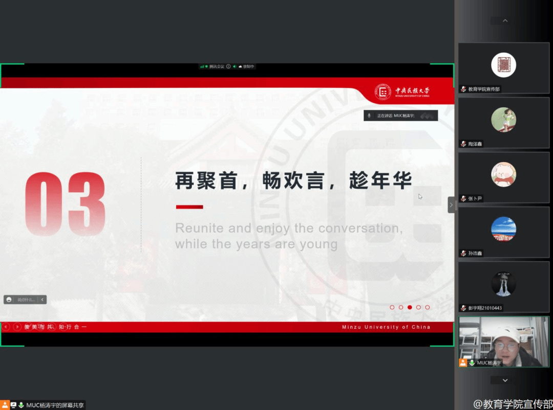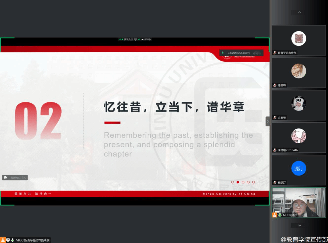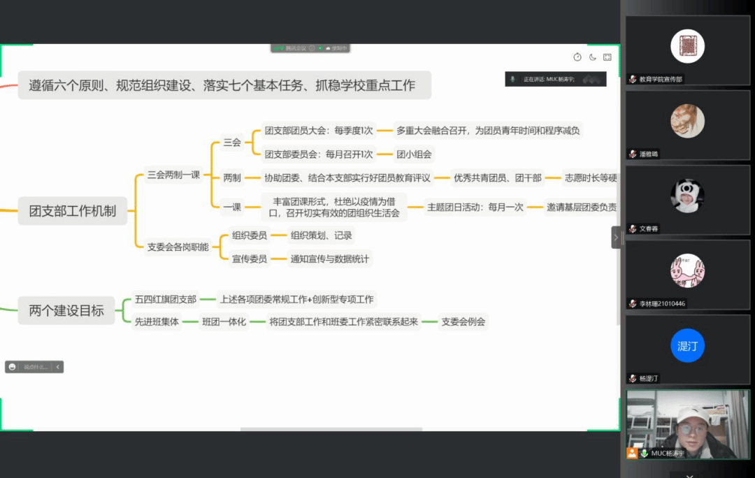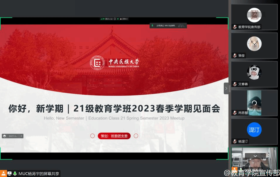 2023年2月17日晚7点30分,21级教育学班依托腾讯会议平台召开“你好,新学期”2023春季学期第一次班会。班主任朱成晨、辅导员杨湜汀老师及教育学班全体同学参与本次会议,会议由班级团支书杨涛宇同学主持。