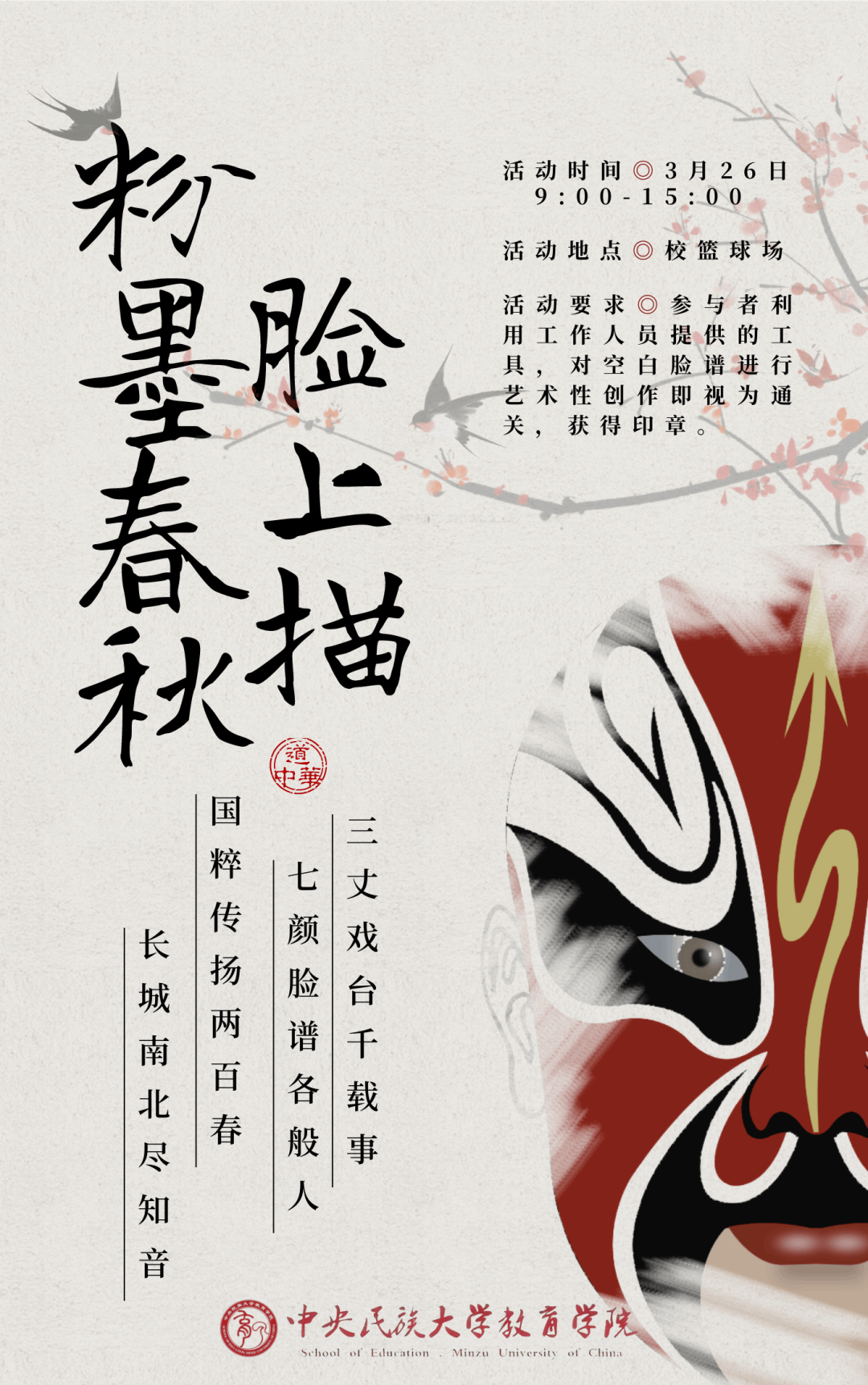 三丈戏台千载事,七颜脸谱各般人。国粹传扬两百春,长城南北尽知音。脸谱千面,彰显各人心中喜怒嗔欢,传承戏曲文化源远流长。千般粉墨尽落于手,望诸位挥笔落色,描绘眼里脸谱百态。