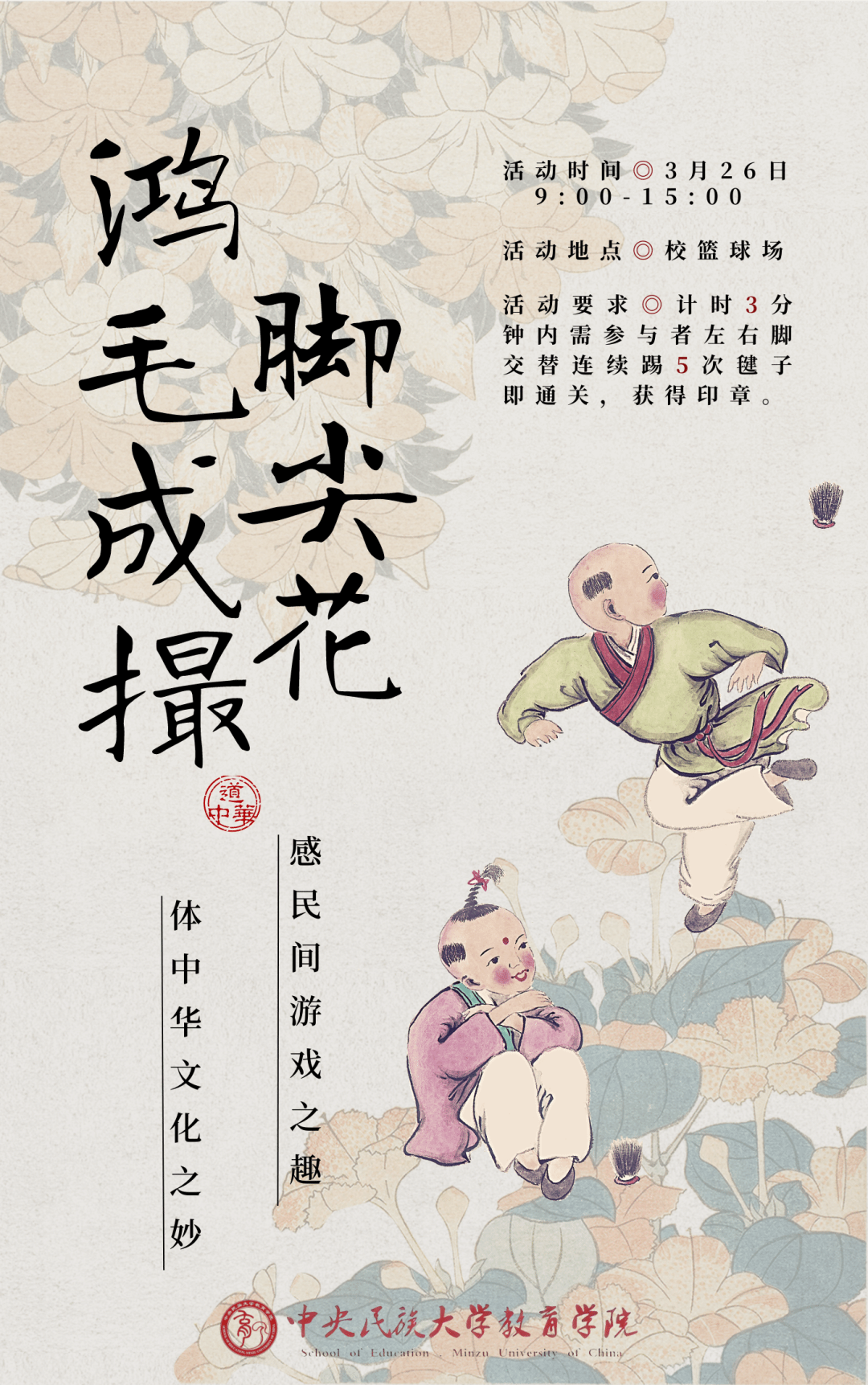 活动要求:工作人员示意后参与者即可开始踢键子,计时3分钟,参与者左右脚交替连续踢5次毽子即通关(毽子落地后当次次数不算,从0开始计数)。