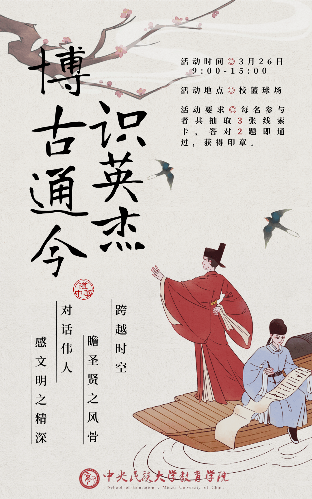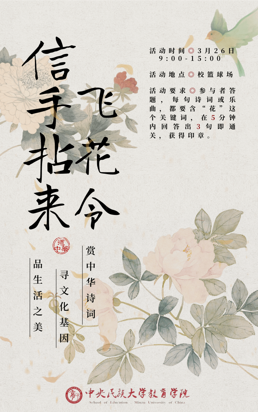 活动要求:在行飞花令之前,工作人员会先给出一个关键字,例如“花”字等。参与者需要在5分钟内回答出3句含有关键词的诗词或乐曲。