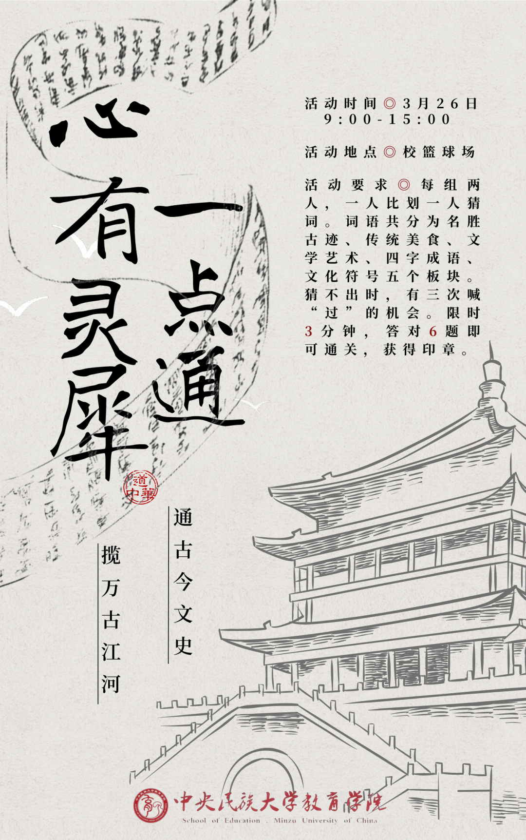 参与者领取集章卡后,通过完成各关卡的任务以集齐前九个关卡的印章,并在第十个关卡登记姓名和学号后,即可获得院级活动证明与中国风贴纸奖品。