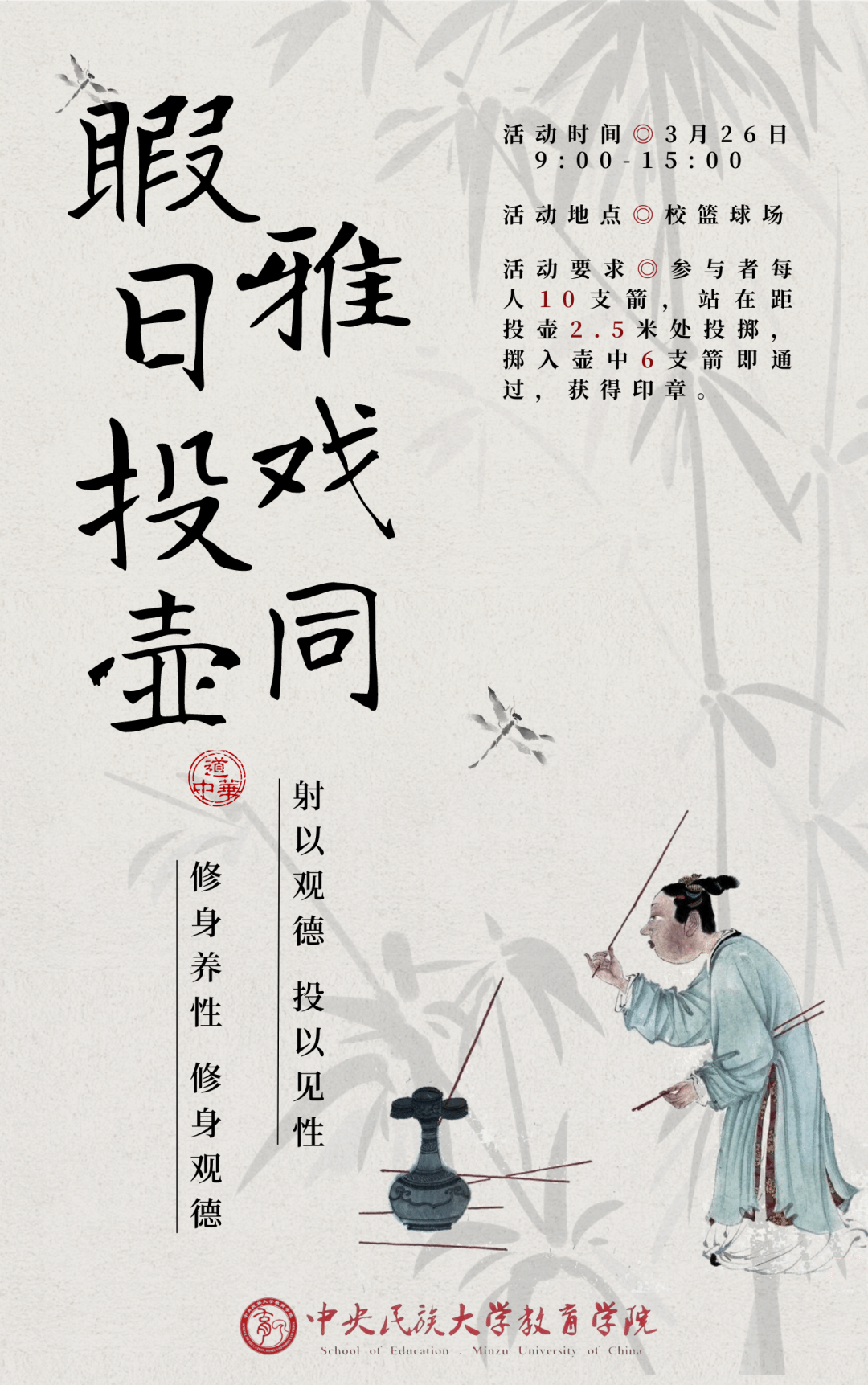 射以观德,投以见性;修身养性,修身观德。投壶作为宴饮时做的一种投掷游戏,在中国古代曾十分盛行,上至天子下至平民皆有所乐。矢与壶之间,是仁义、中庸、哲理的载体,传递着中国文化中的“中正”“中庸”之道。于投壶中传承发扬华夏礼仪,回归传统游戏、品味传统文化的同时,也帮助锻炼专注力、控制力和手眼协调能力,愉悦身心。