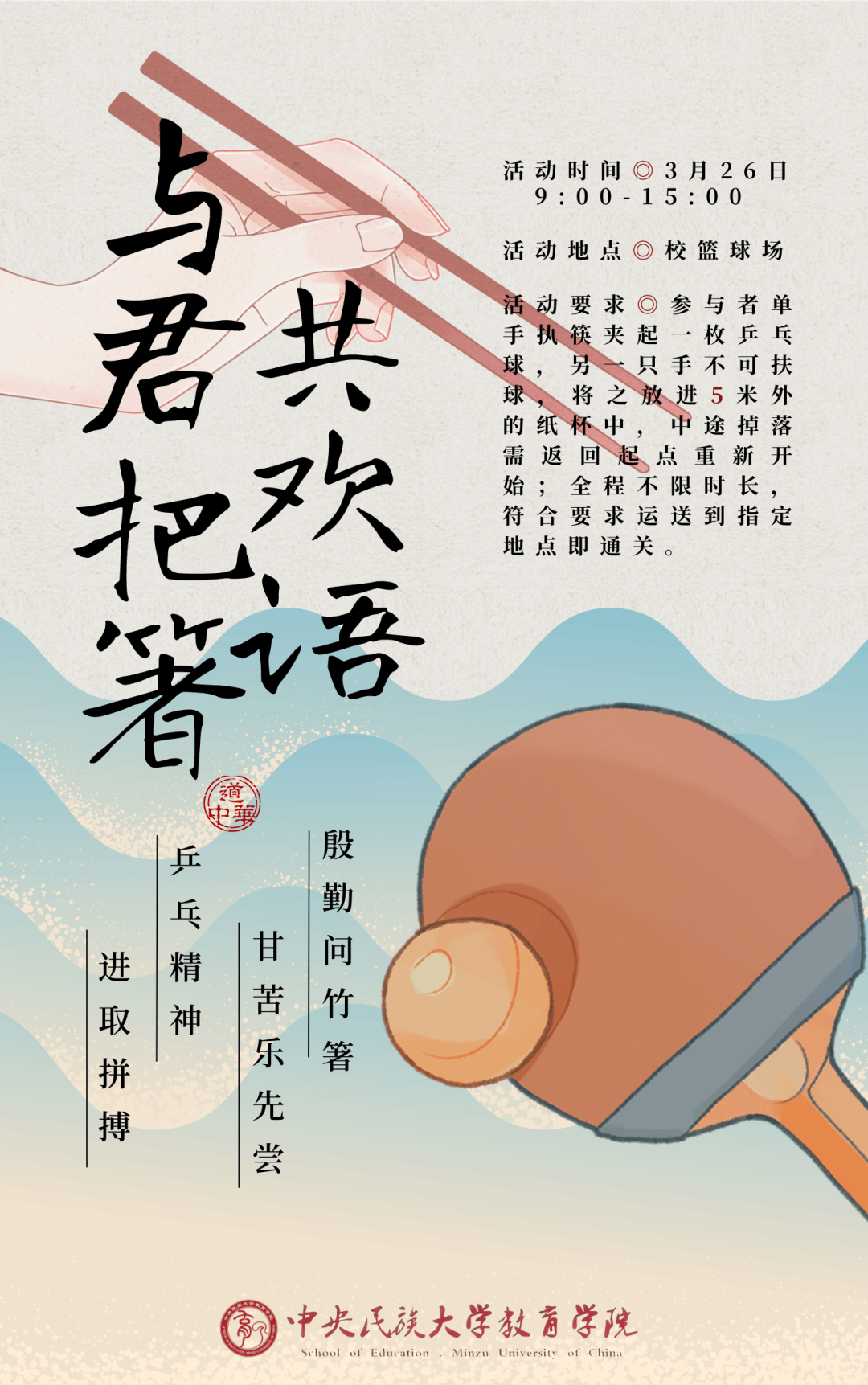 殷勤问竹箸,甘苦乐先尝。乒乓精神,进取拼搏。传统文化符号与现代体育项目之间的碰撞,将激起绚烂的文明火花。筷子承载传统文化意义的同时也是丰富的民俗象征符号。领略筷子的丰富文化内涵,以此感受历久弥香的文化气息。