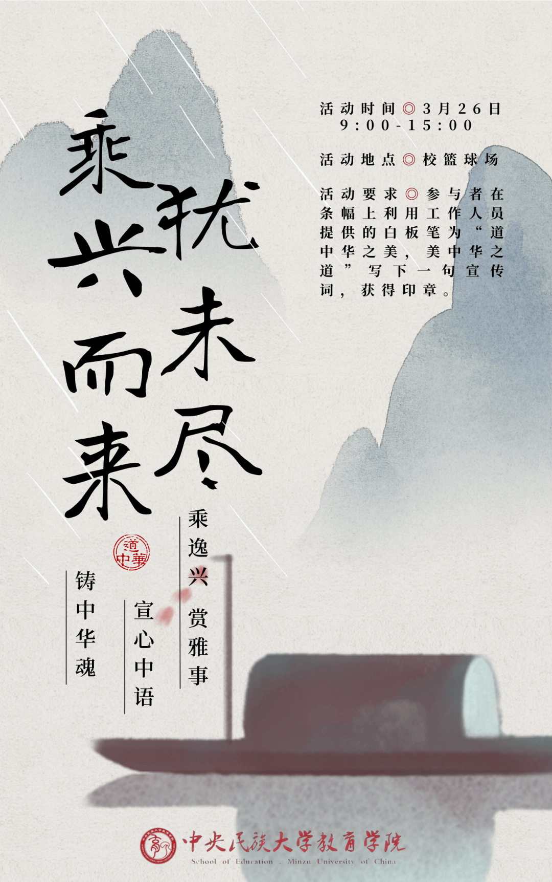 乘逸兴,赏雅事,宣心中语,铸中华魂。在当代共道中华,宣扬传统文化,是每一个人的使命与职责。以笔写下自己道中华的宣言,激励大家增强文化自信、根植精神动力,弘扬民族传统美德,加强思想道德建设,铸牢中华民族共同体意识。