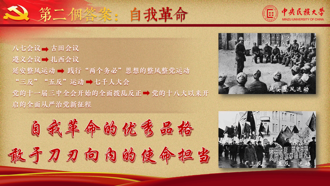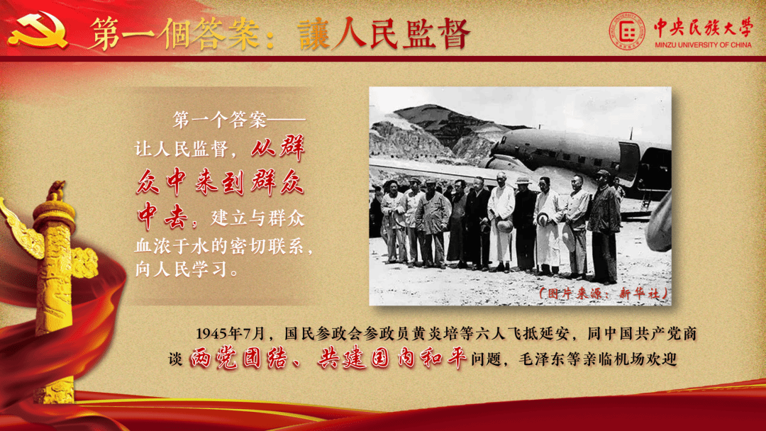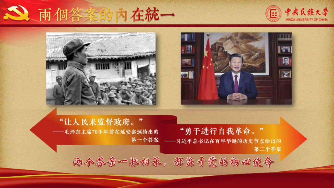 本作品紧扣本次思政课公开课展示活动主题“青春献礼二十大•强国有我新征程”。着重关注党的十八大以来,习近平总书记所讲的跳出历史周期率问题,即关系到党千秋伟业的重大问题。针对这一问题,毛泽东主席在延安的窑洞里给出了第一个答案,就是“只有让人民来监督政府,政府才不敢松懈”。经过百年奋斗特别是党的十八大以来新的实践,我们党又给出了第二个答案,即自我革命。两个答案,跨越了一个政党从弱小到强大、从九死一生到蓬勃兴盛的漫漫岁月长河。从探寻党和人民的关系,到同时将目光放于党的自身。其中一脉相承的,是走好“赶考”之路的清醒坚定,是走得再远都不会忘记的初心使命和历史自信。