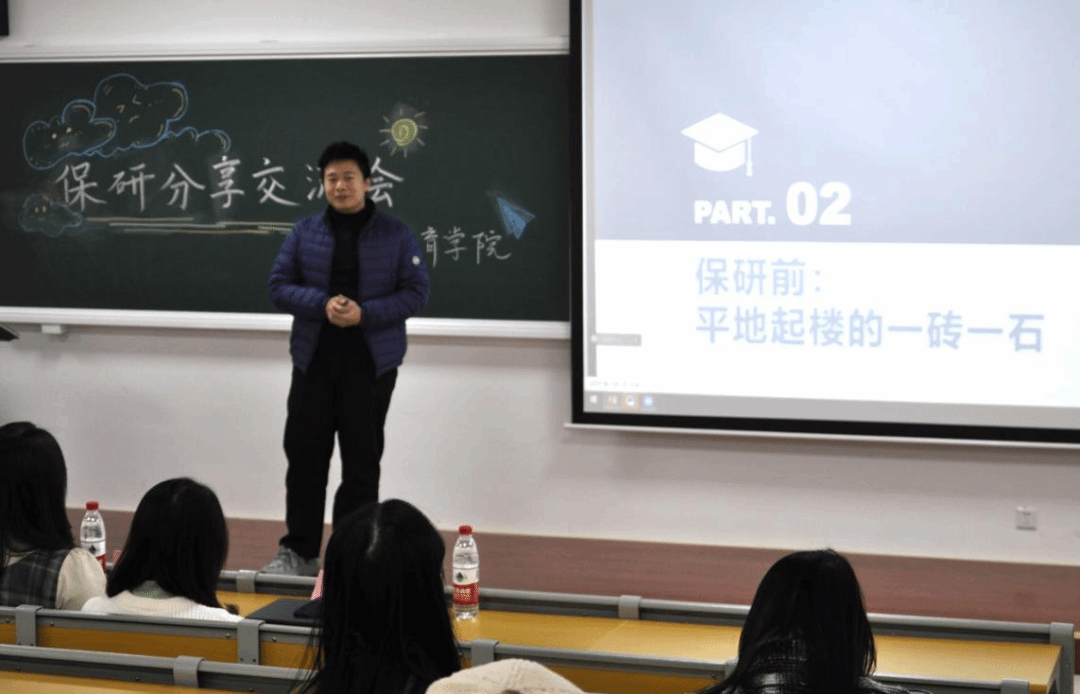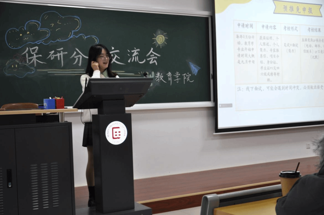 首先,杜纪悦同学向同学们介绍了普通推免、思政保研推免、支教保研推免和创新创业推免四种推免保研方式的共同要求,并分别介绍了四种保研方式各自需要的特殊条件。接着她对思政保研详细展开阐述,强调思政保研的条件:除满足学业成绩、外语成绩和奖项要求外,还需要满足政治面貌为中共党员、担任B岗不少于1年或在校期间有参军入伍服兵役、到国际组织实习的经历和无违纪行为等条件。在思政保研的选拔过程中,她建议同学们要积极参加学校夏令营,提前取得推免名额,并结合选拔要求和群面形式提前准备面试的个人介绍及情景问题。在准备学院面试时要关注教育热点、复习学科知识、拓宽国际视野,在进行自我介绍时突出个人特点,以引导老师提问。