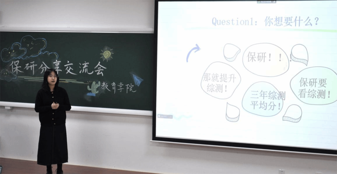 首先,石益静同学介绍了自己的个人基本情况,包括综合排名、英语成绩、保研去向、荣誉奖项及科研和实践经历。在推免保研的准备方面,她分享了个人经验:首先要重视学业成绩,在充分了解自身能力的基础上平衡好学业与学生工作;其次要积极参与文体和实践活动;在参与评选个人荣誉时要研究评选细则、注意志愿时长;在科研竞赛方面,她重点推荐“大创赛”,并详细介绍了参加学科类竞赛、非学科类竞赛一些经验。此外她还给同学们提供了选择活动时的建议:应选择适合教育学专业同学参与的且自身擅长的活动。最后,在心态方面,她建议同学们在保研名额分配之前保持良好心态,按部就班完成自己的计划。