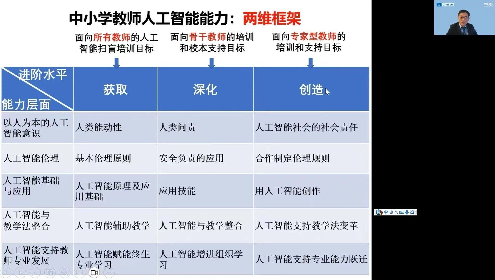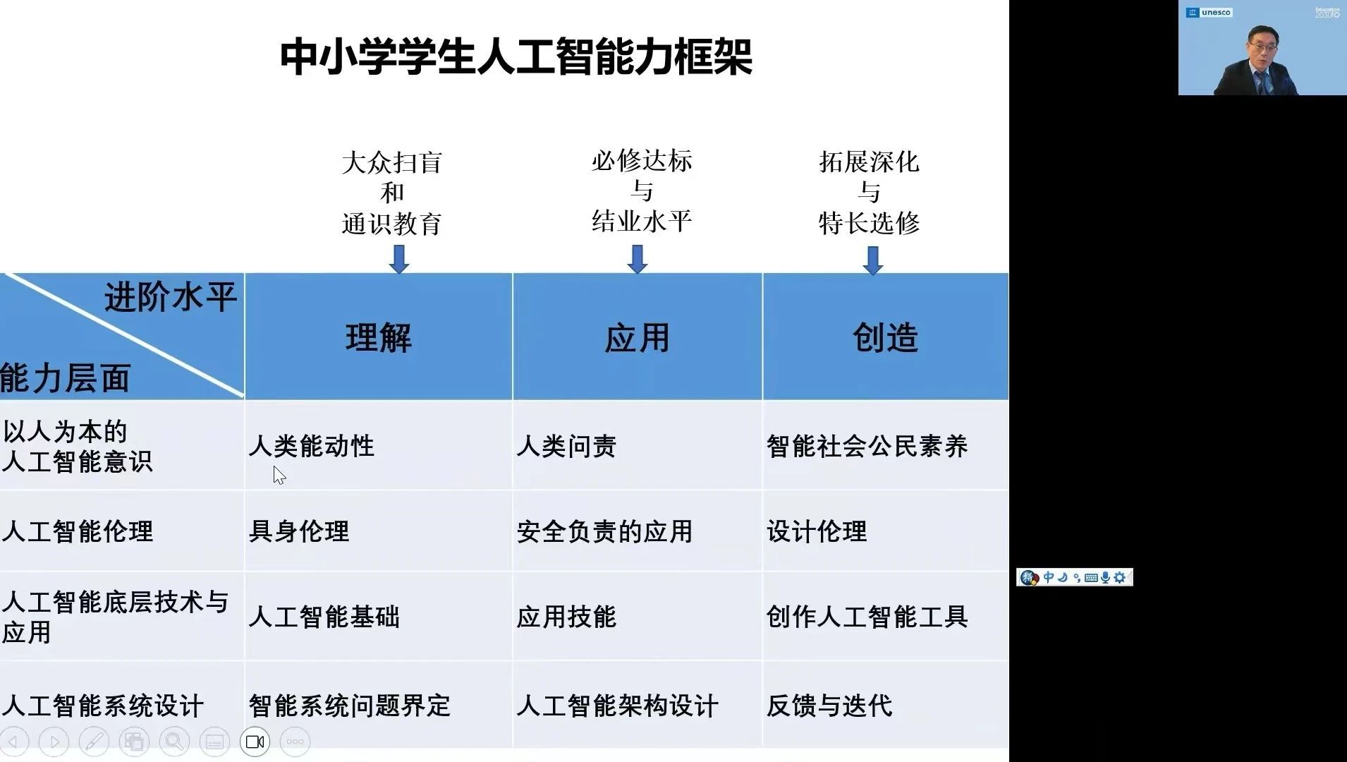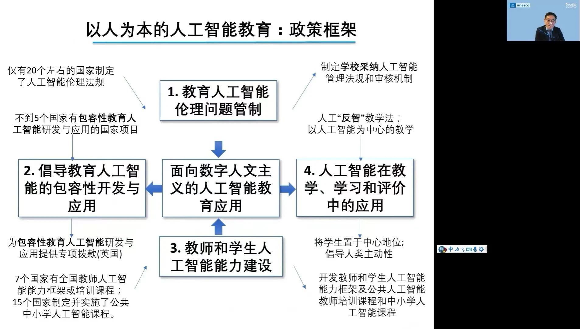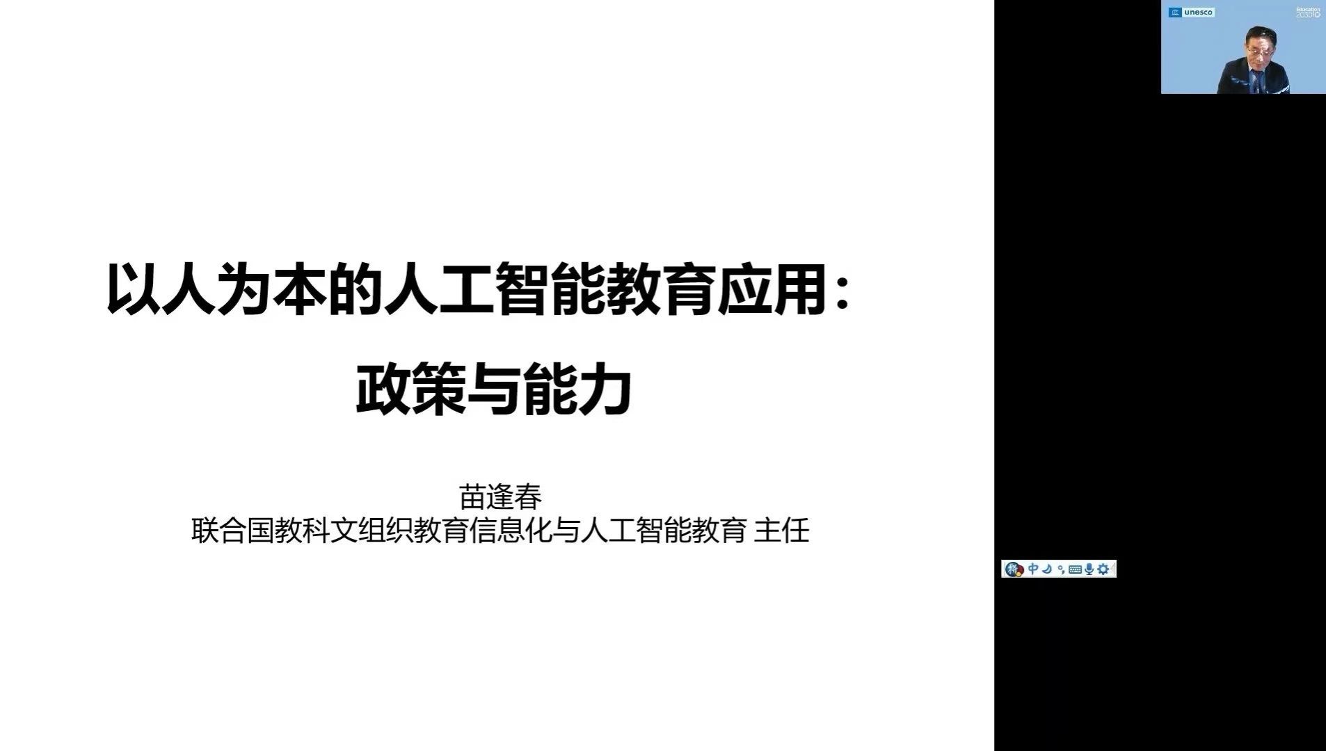 苗逢春博士围绕三个方面展开讲座,一是以人为本的人工智能与教育:政策框架;二是UNESCO全球中小学生人工智能能力框架;三是UNESCO全球中小学教师人工智能能力框架。