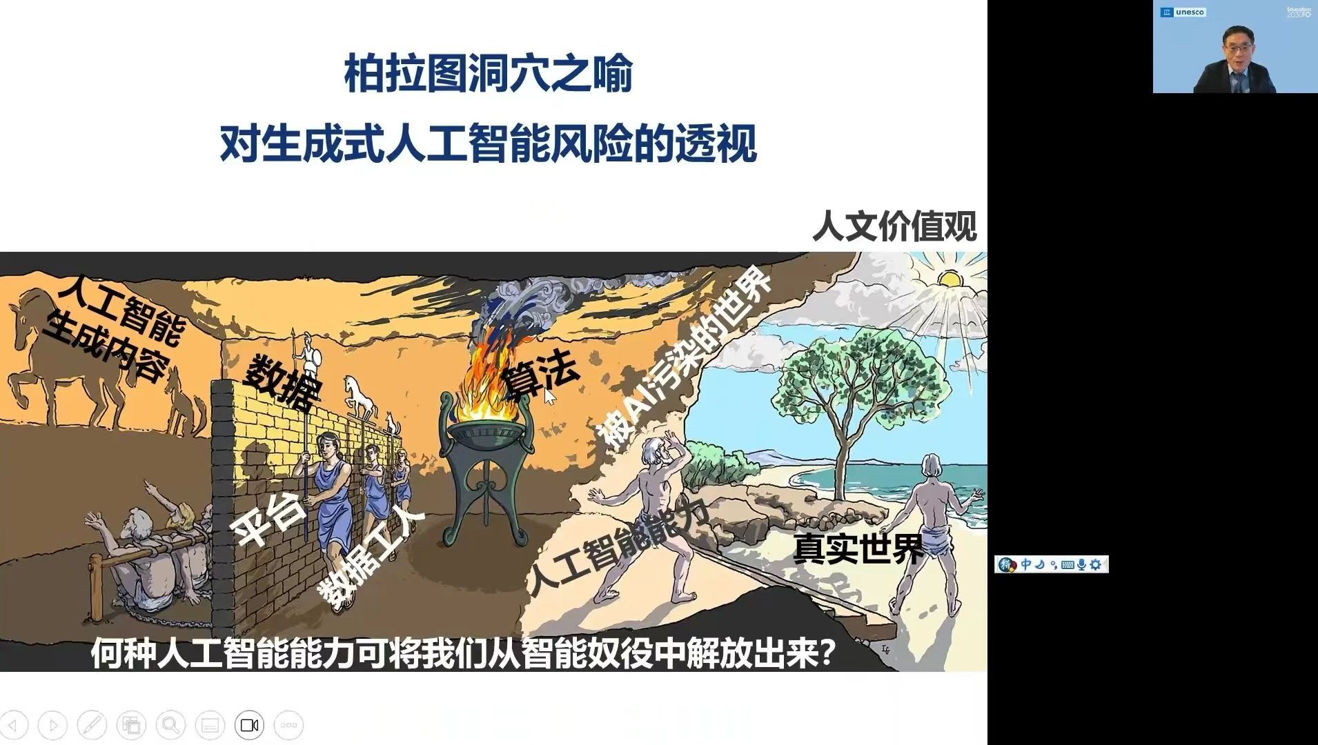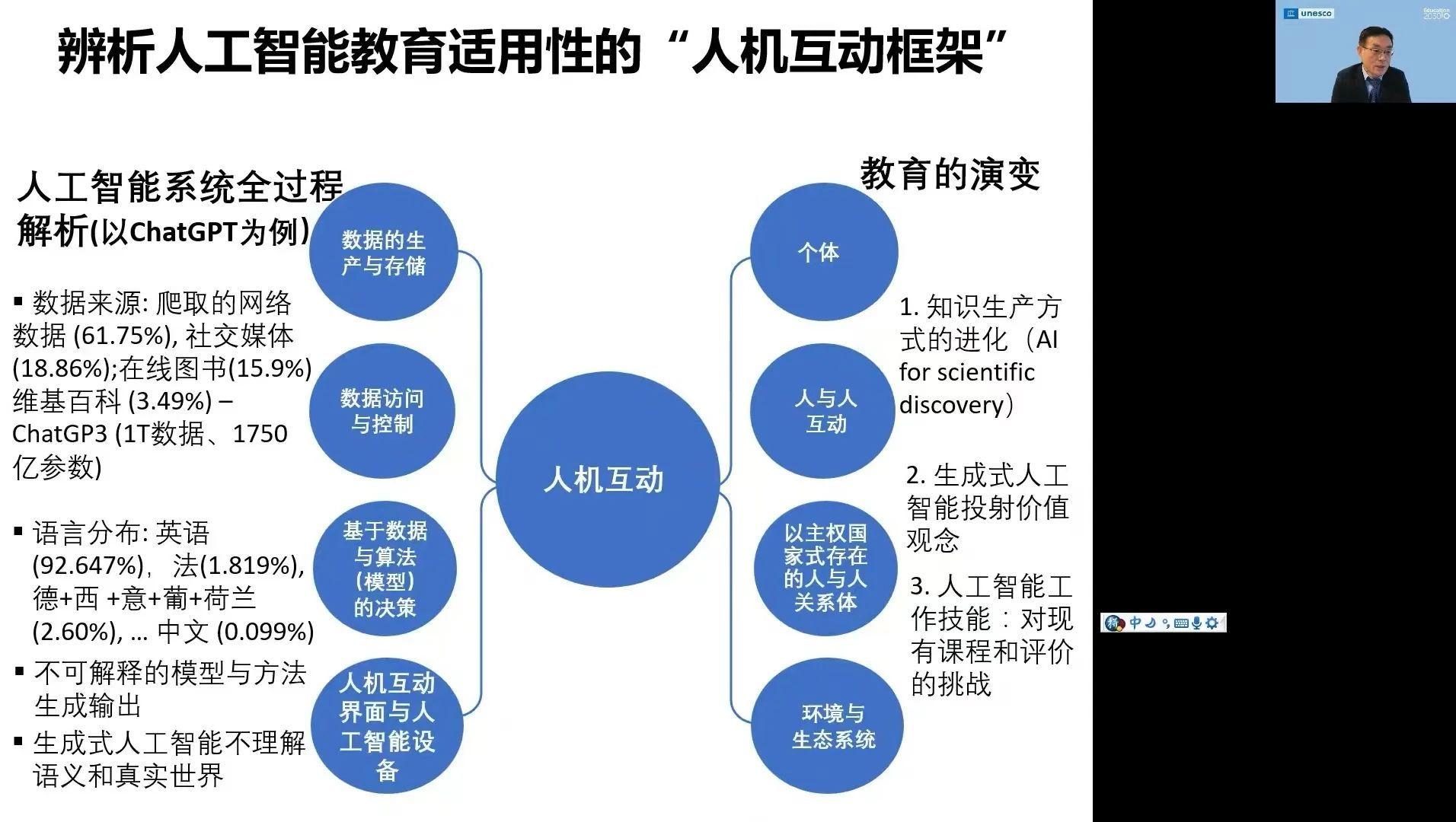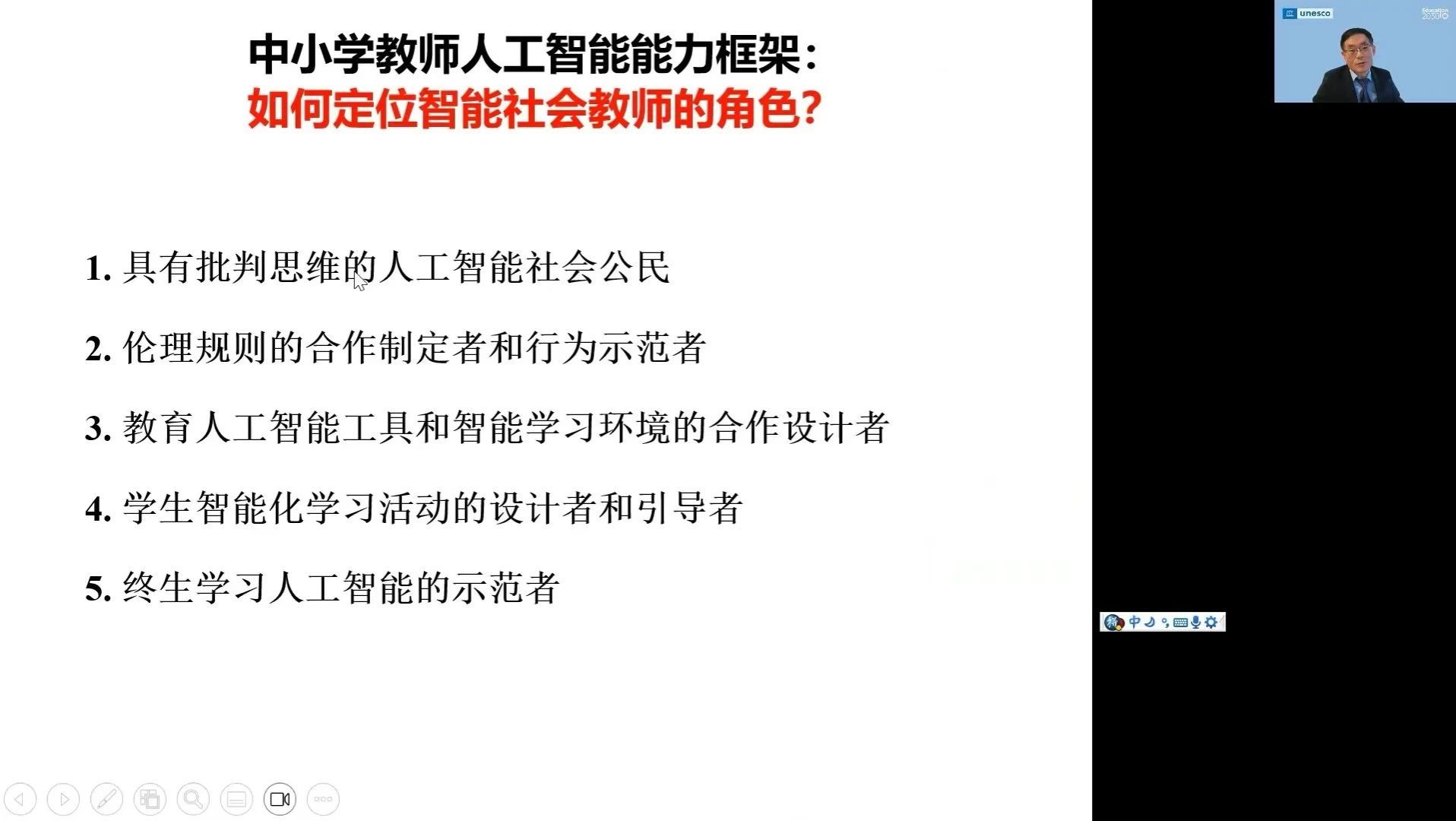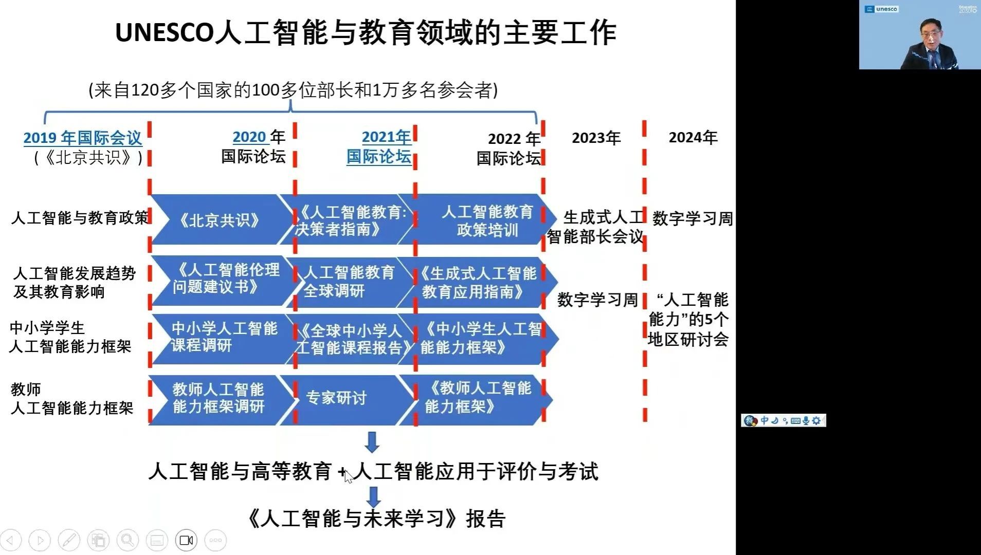 苗逢春博士围绕三个方面展开讲座,一是以人为本的人工智能与教育:政策框架;二是UNESCO全球中小学生人工智能能力框架;三是UNESCO全球中小学教师人工智能能力框架。