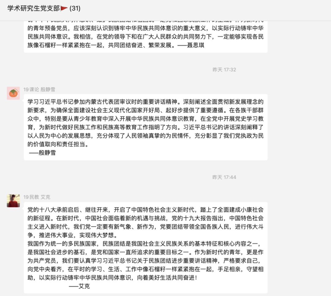 2021级教育学二学位党支部党员一致表示: 首先,习近平总书记在参加内蒙古代表团审议时强调,民族团结是我国各族人民的生命线,中华民族共同体意识是民族团结之本,各民族在中华民族大家庭中要像石榴籽一样紧紧抱在一起。从中,我们可以得出民族团结的重要性。william威廉中文官网是一所致力于为各民族培养人才的高校,民大学子将来或许会投身于各民族地区的工作岗位,因此我们身为william威廉中文官网的学生,更应该学习相关精神,铸牢中华民族共同体意识,在学习生活中贯彻民族团结的理念,团结好身边各民族同学,为维护民族团结贡献自己的一份力量。