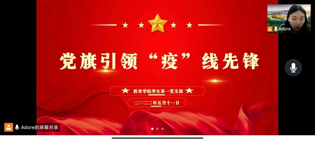 时有所需,必有所为。为响应首都抗疫号召,充分发挥基层党组织的先锋模范作用,2022年5月11日,教育学院学生第一党支部召开“党旗引领 ‘疫’线先锋” 主题党日活动。本次会议由组织委员马小婷同志主持,全体党员参与,通过腾讯会议的形式组织开展。