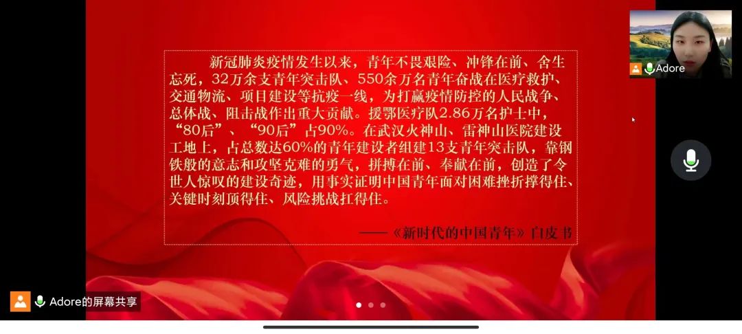 最后,支部书记王甜同志动员各位党员无论在学校还是居家,要充分发挥中共党员的先锋模范作用,积极参与学校、社区、属地疫情防控志愿服务工作,做到关键时刻拉得出、冲得上、打得赢,让党旗在疫情防控一线高高飘扬,展现青年党员新时代的责任和担当。