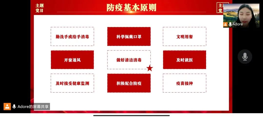 其次,支部全体党员就各自的防疫行动和身边的典型案例展开交流,并在支部群分享各自的防疫行动照片。在本轮防疫过程中,我支部各位党员积极作为,贯彻落实上级和学校以及所在地区疫情防控政策要求,按照防疫基本原则,在校的党员同志积极配合学校多轮全域预防性核酸检测,未返校的党员同志在家自觉做到勤洗手、开窗通风、锻炼身体增强体质,在支部形成凝心聚力、共克时艰的良好氛围。