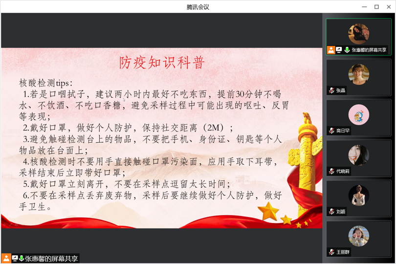 接着,张惠馨同志通过视频、图片的形式向大家进行了防疫知识科普,如何时何地应佩戴N95或KN95口罩;进行核酸检测前的注意事项;抗原自测试剂盒的使用方法以及高校疫情防控大学生警示教育典型案例等。