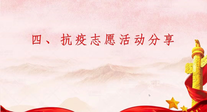 最后,由党支部的霍旭菡同志、李若涵同志以及张梦荞同志分享了他们的志愿者经历。霍旭菡同志在做志愿者的过程中,感受到了党和政府的有力支持与保障,以及基层工作人员以及医护人员的艰辛;李若涵同志认为作为一名普通的青年,要为社会做出自己力所能及的事情;张梦荞同志至今已参与了18次核酸检测工作,每当听到居民的声声感谢时,她总是会为之动容。