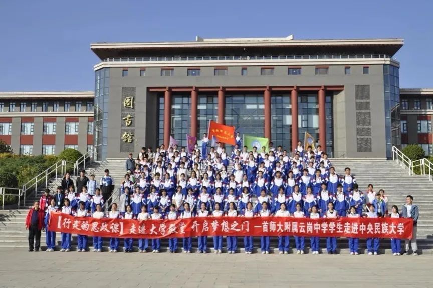 阳光普照大地,秋色点缀佳时。今天,我负责引导云岗中学高三(1)班的可爱学生们参观民大丰台校区。刚到门口,同学们就兴高采烈地问我此次路线,向我咨询民大的特色和校园风采,我一一回答。参观途中,我们敬仰“团结”,倾听校史,探索教学楼,欣喜于先进的图书馆和智慧中心。最后我们走向体育场,细嗅青春昂扬的气息。