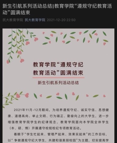 3.为《新生引航系列活动·遵规守纪之班会与寝室学习活动》撰写推送稿。
