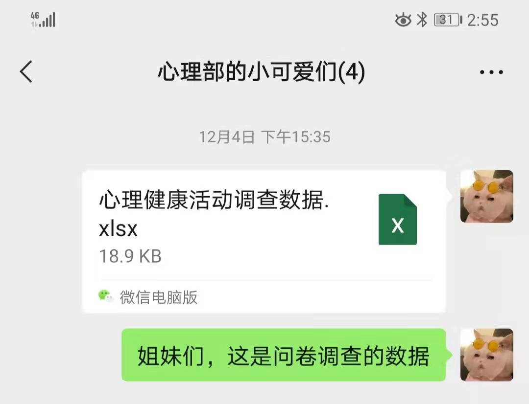 2.分析研究生心理健康问卷调查的结果。在上一阶段,为更好掌握同学们的心理健康信息情况以展开针对性工作,我部向教育学院全体研究生发放并回收了“研究生心理健康状况调查”问卷,本月上旬对此进行分析,以便展开第二次心理论坛活动。