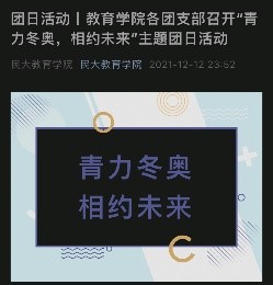 2、本月组织部撰写了1篇团日活动推送,反映了我院各支部积极学习十二月主题团课“青力冬奥,相约未来”的精神风貌。