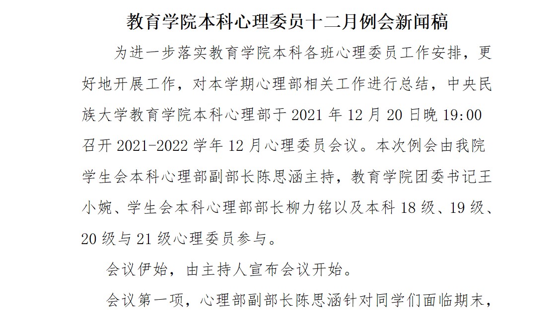 在本月月末,我部门召开了“心理委员会议”。本次会议促进了心理委员之间工作方法的交流,帮助心理委员进一步明确了自己的职责,并且很好地总结了本学期各项工作,为日后心理健康相关工作的开展奠定基础。