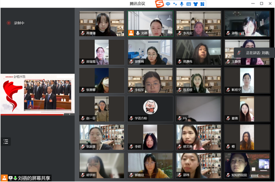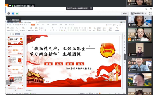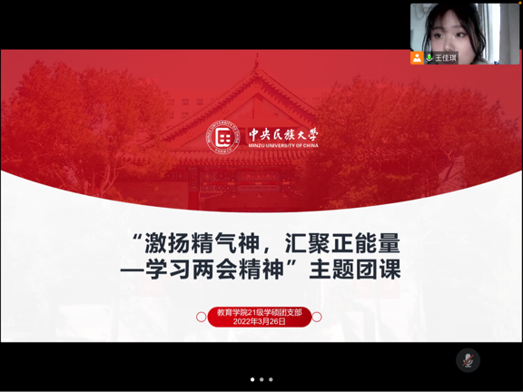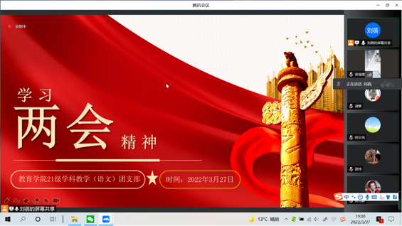 为了紧跟时事热点,也为了促进同学们对两会精神的领会,2022年3月27日我们教育学院21级学科语文团支部全体团员借助腾讯会议app,开展了主题为“激扬精气神,汇聚正能量——学习两会精神”的线上主题团课。