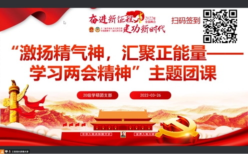 “激扬精气神,汇聚正能量——学习两会精神”团日活动于2022年3月26日下午4点在腾讯会议正式开始,团支书王佳琪简明的介绍了两会精神后,同学分纷纷各抒己见,分组讨论了两会的十大热点问题,同学们积极发言,将团日活动推向高潮。