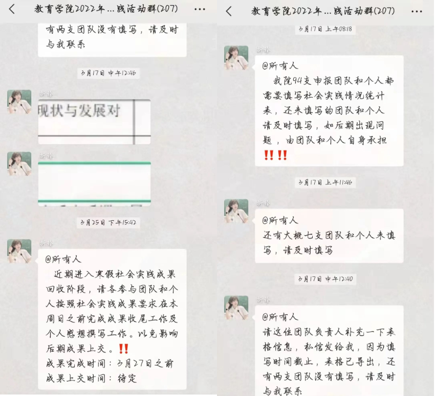 2022年3月中旬至下旬,团委科创实践部2022年寒假社会实践成果回收工作陆续开展。团委科创实践部部长折玲对寒假社会实践成果回收的要求以及相关注意事项进行整理并发布在教育学院2022年寒假社会实践群中,此次资料及相关要求的发布为后续寒假社会实践成果回收与评比工作的开展奠定基础。