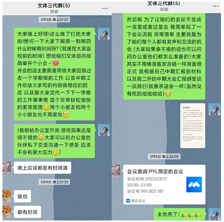 1.3月8日和3月17日,分别组织召开学生会办公室、文体部的部门中期工作会议。会上总结了上一学期各部门及成员的工作情况,及时复盘工作中的经验与不足;同时展望和部署了新学期的相关工作安排,为接下来开展的相关工作奠定基础。会议期间,各成员还互相分享了上一学期的收获与感想,进一步增进了各成员间的了解与沟通,部门内部营造出“同成长共进步”的团结氛围,有效提升了办公室和文体部的部门凝聚力。