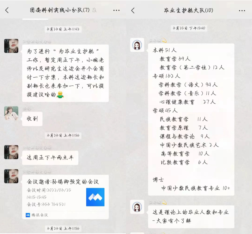 2022年3月25日,团委科创实践部召开为毕业生护航工作会议。会议上,团委书记王小婉老师提出要将毕业生护航工作定点分配,专人负责,方便后续工作的开展。同时小婉老师提出将工作分为经验交流、信息传达、信息收集、能力提升和去向数据统计与个性咨询五类,并介绍了工作开展的具体方向,有助于后续为毕业生护航工程工作的开展。