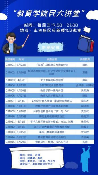 2.海报3个:教育学院民大讲堂整体宣传海报、教育学院民大讲堂海报模版、教育学院大讲坛系列第二期海报;