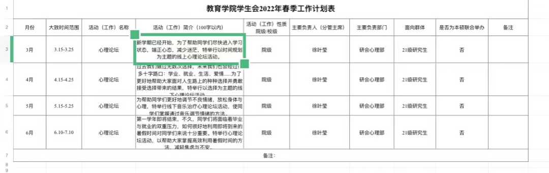 3.汇总整理教育学院研究生会2022年春季工作计划表并留档。